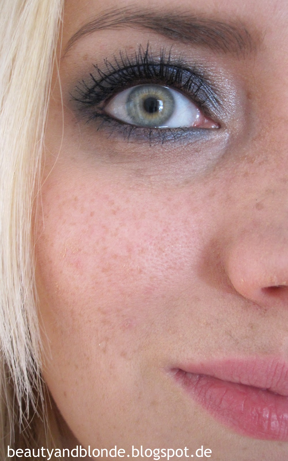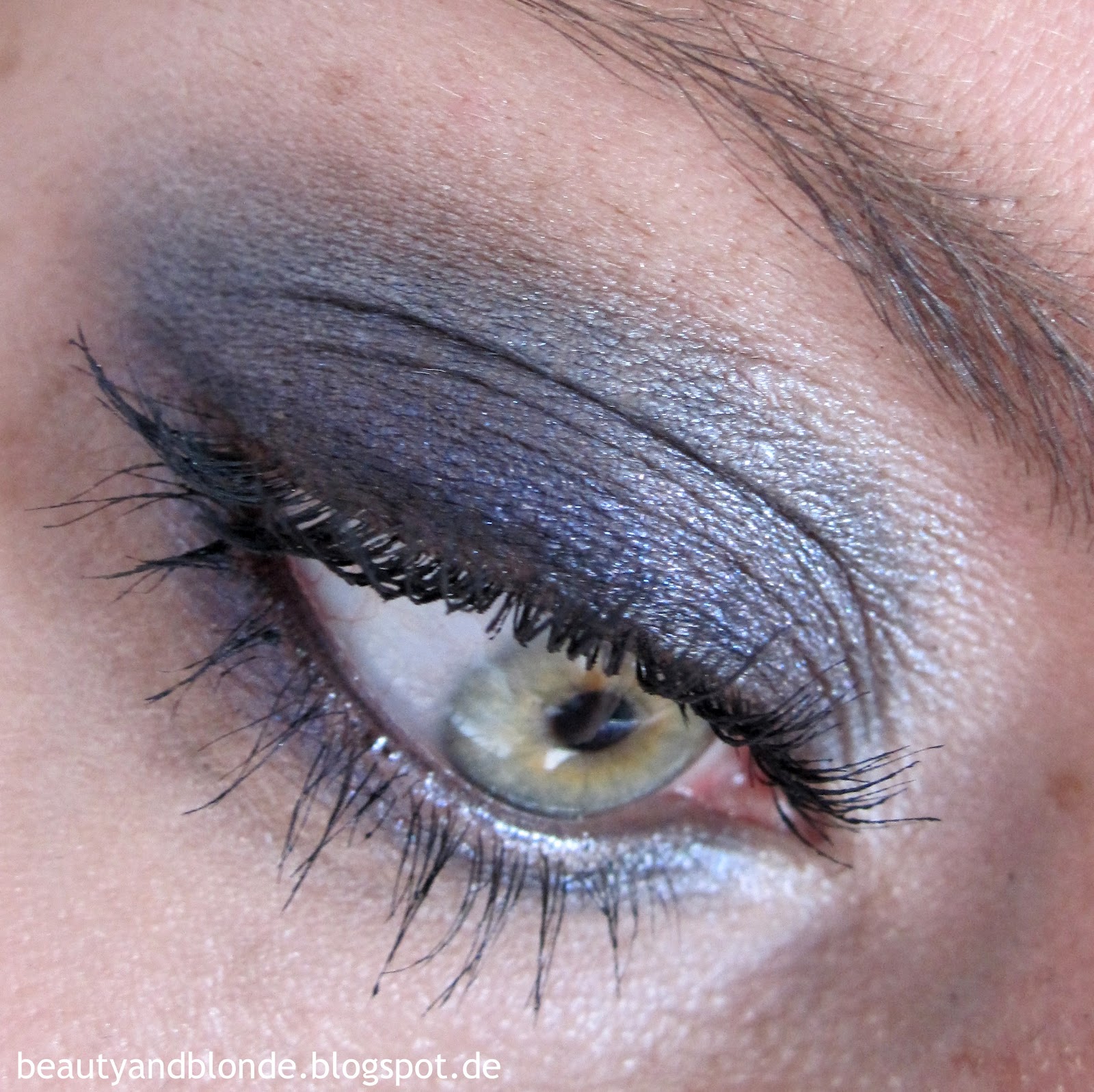 Als Highlighter habe ich den hellen schimmernden Ton benutzt, diesen habe ich unter der Augenbraue und im Innenwinkel benutzt.