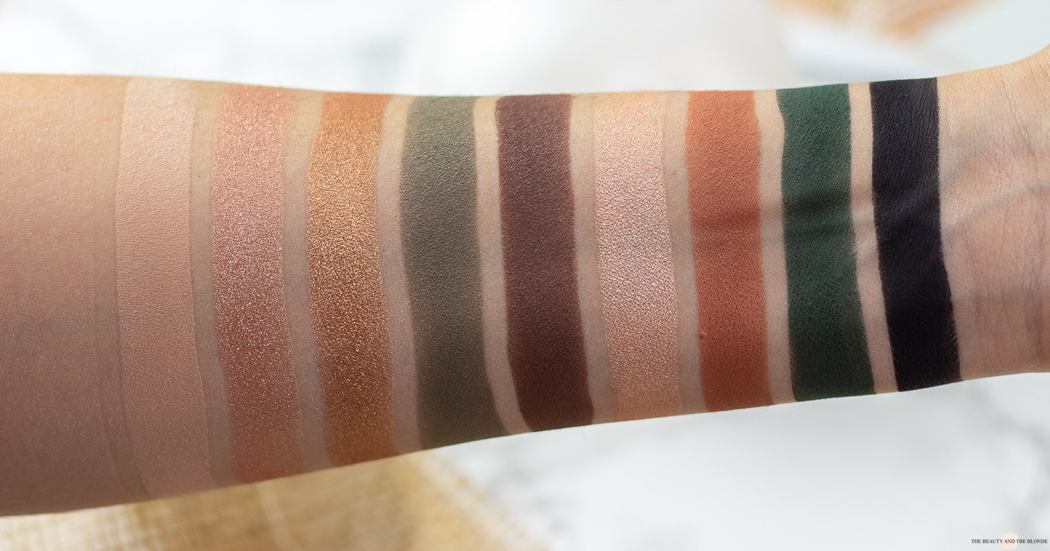 Spannend waren für mich vor allem die Grüntöne, die, wie bereits gesagt, auch in deutlich teureren Paletten oft sehr schwierig in der Handhabung sind. Oft stimmt die Pigmentierung nicht und man hat seine liebe Not damit, die Farben deckend aufs Auge zu bekommen, ohne dass die Farben am Ende fleckig werden. Erstaunlicherweise sind die Farben aber wirklich genial. Das hellere Grün wird beim Ausblenden leicht gräulich, was aber zu erwarten war und für mich daher nicht weiter schlimm ist. Das dunklere Grün, ein wunderschöner Ton, lässt sich problemlos layern und ausblenden und behält dabei auch seine Pigmentierung bei. Ich hätte erwartet, dass gerade dieser dunklere Ton deutlich schwächer am Auge herauskommen würde, als es letztendlich der Fall war.